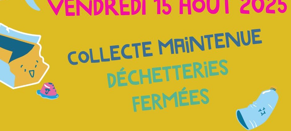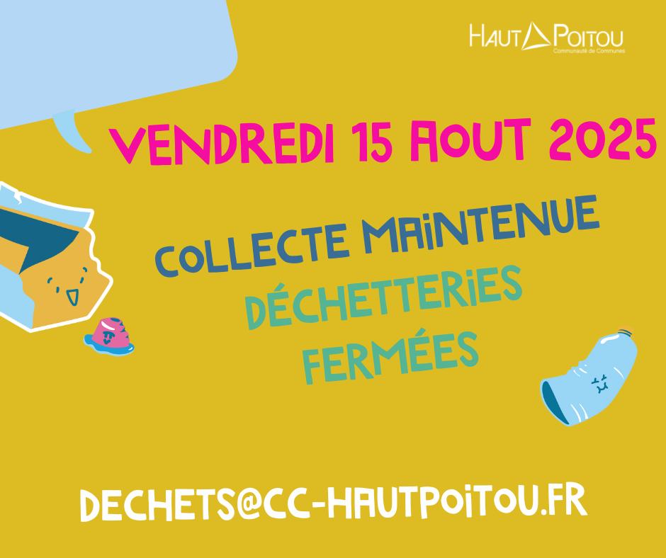 Collecte et déchetterie – 15 août14 août 2025/dans Actualités /par FPLa collecte des déchets est maintenue. Les déchetteries sont fermées. https://cc-hautpoitou.fr/wp-content/uploads/2025/08/dechet15aout.jpg 788 940 FP https://cc-hautpoitou.fr/wp-content/uploads/2021/09/LOGO-DEFINITIF-PNG.png FP2025-08-14 14:15:092025-08-14 14:15:09Collecte et déchetterie – 15 août